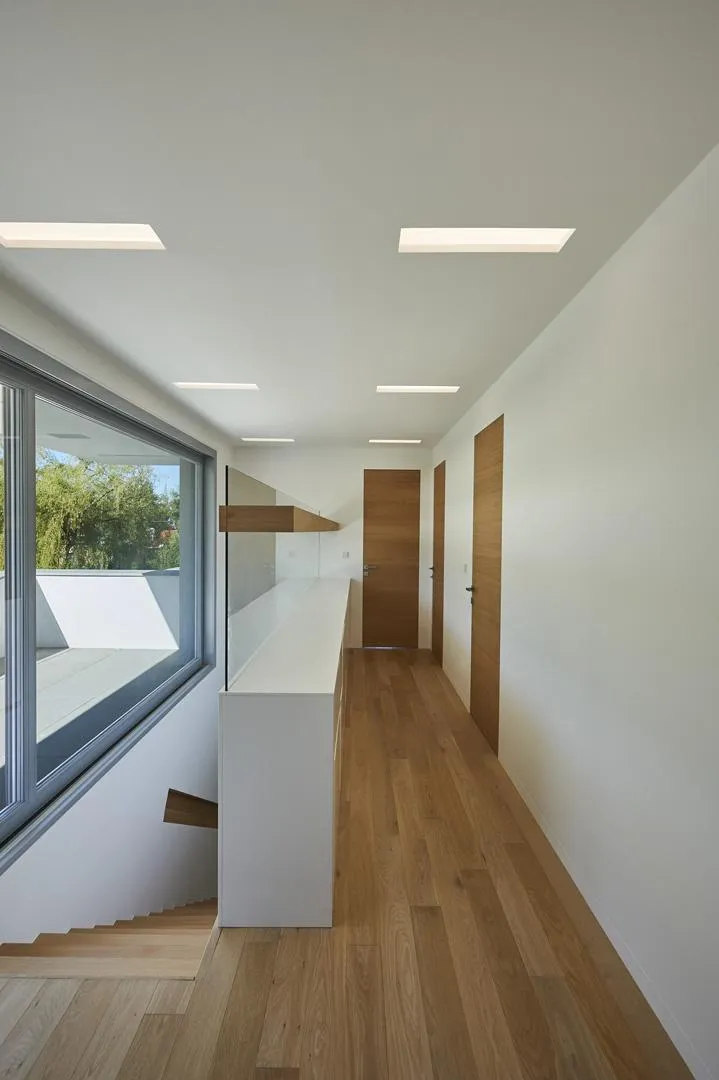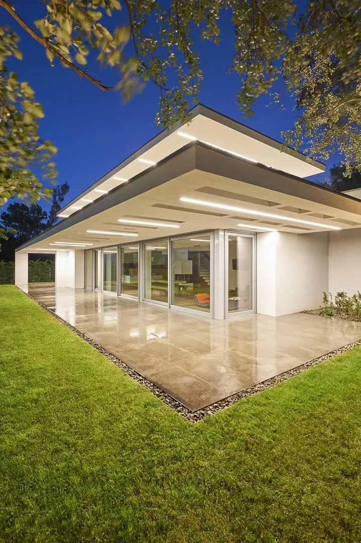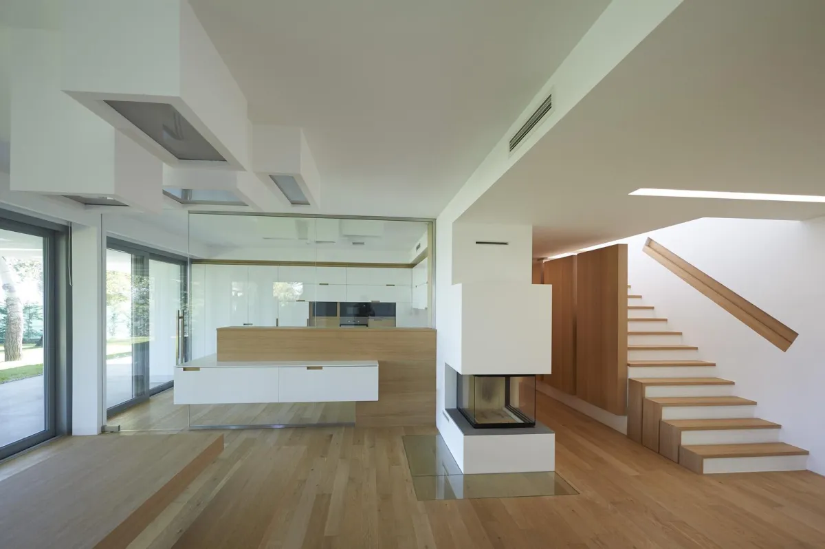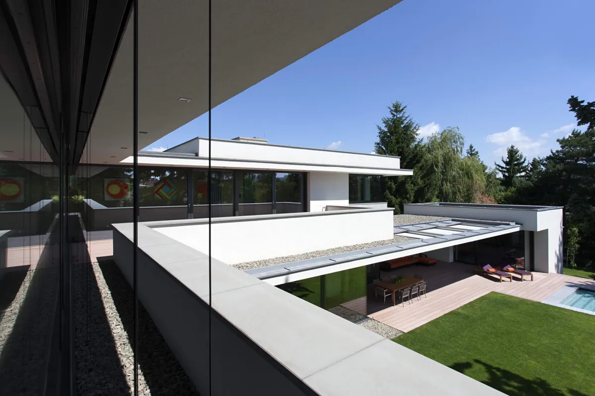 A dombok közt felépült villa területén egykor fenyőerdő állt. A mára megmaradt fák közt pavilonosan széthúzott funkciók a derékszögű koordinátarendszert követik. A tér- és tömegarányok jó megválasztásával, a jelentős üvegfelületek reflexiójával az épület a körülötte lévő parkban feloldódik. Az épület építészeti formavilágával, a derékszögű szerkesztés betartásával gazdag térszövetet hoz létre. Miközben jól tudjuk, hogy éppen melyik helyiségben vagyunk, mégis egyszerre tudunk az egész házban létezni. Az áramló tér maximális komfort mellett válik élvezhetővé. Az épületben bármerre fordulva, a nagy üvegfelületeken át, a környező parkban érezzük magunkat.